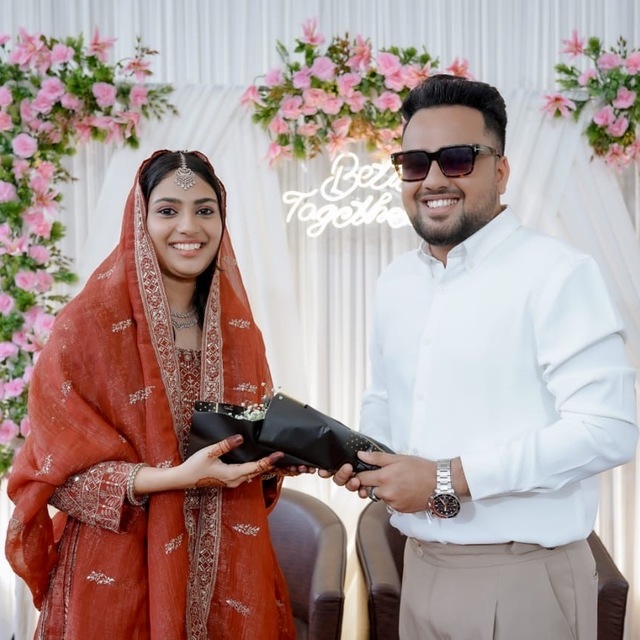 My name is Mizriya, I am 24 years old and currently pursuing my MBA. Our story began quietly during a wedding in my native place, where I first noticed Nabeel. At that time, it was just a moment, and he didn’t notice me. Life moved on, but destiny had its own plans. Some time later, I unexpectedly saw him again near my home. This time, he struck up a conversation, saying I looked familiar and asking if we had met before. That simple interaction turned into meaningful conversations and a beautiful connection.